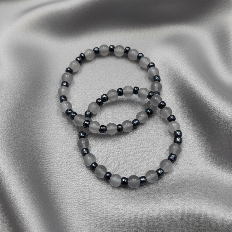 The Shadow & Mist bracelet combines soft milky gray glass beads with shimmering onyx metallic seed beads on a flexible elastic band. Designed for comfort and ease, it gently complements any outfit while adding a subtle touch of elegance. Perfect for everyday wear, this bracelet brings a calming, understated style to your collection.